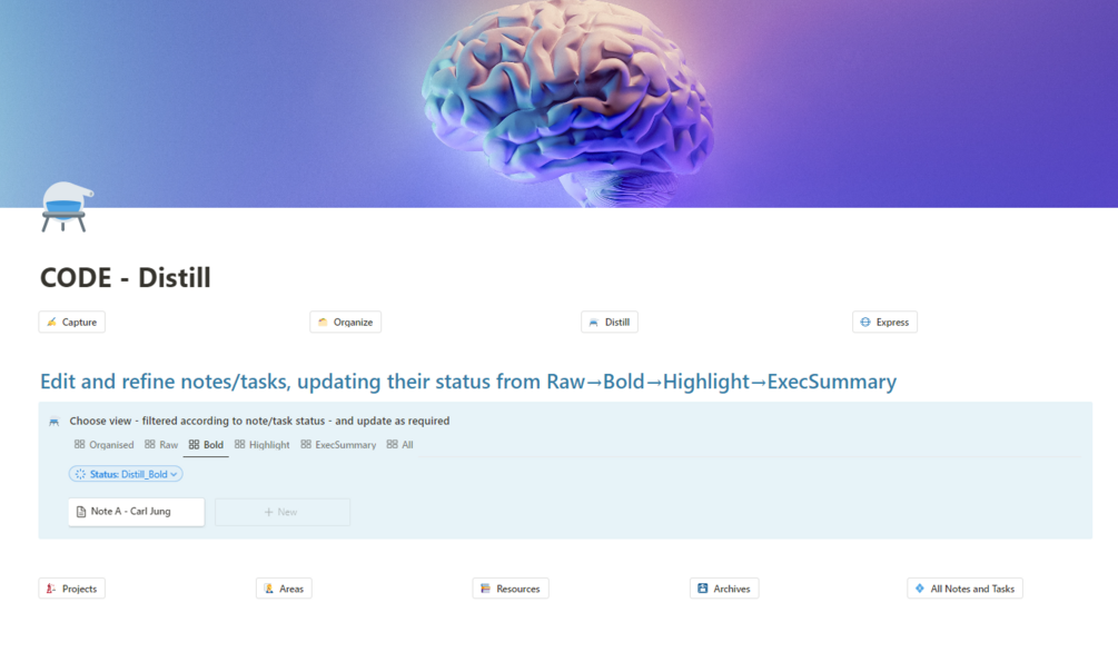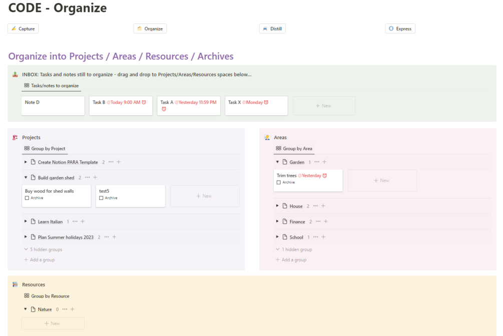 Easy-to-use Capture / Organize / Distill / Express pages, with new Notion buttons and drag-and-drop to allow you to quickly prioritize note/tasks and move them between Projects / Areas / Resources / Archives.