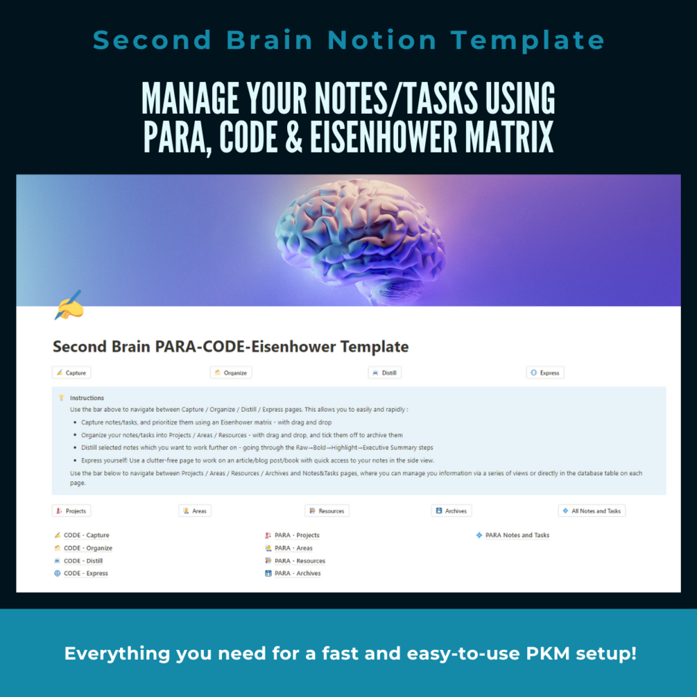 Complete Second Brain / PKM setup which allows you to create and manage your notes/tasks in Notion using PARA, CODE and Eisenhower matrix techniques.