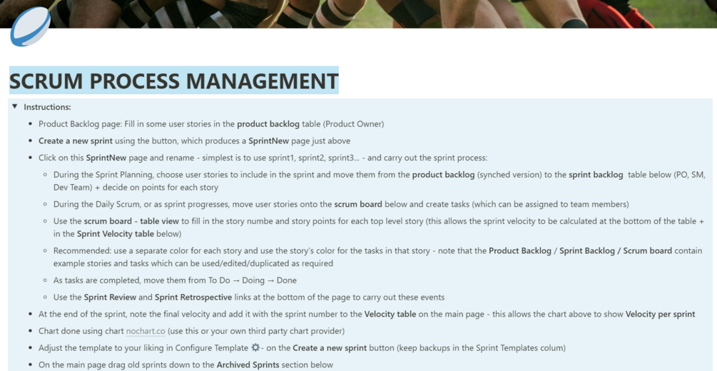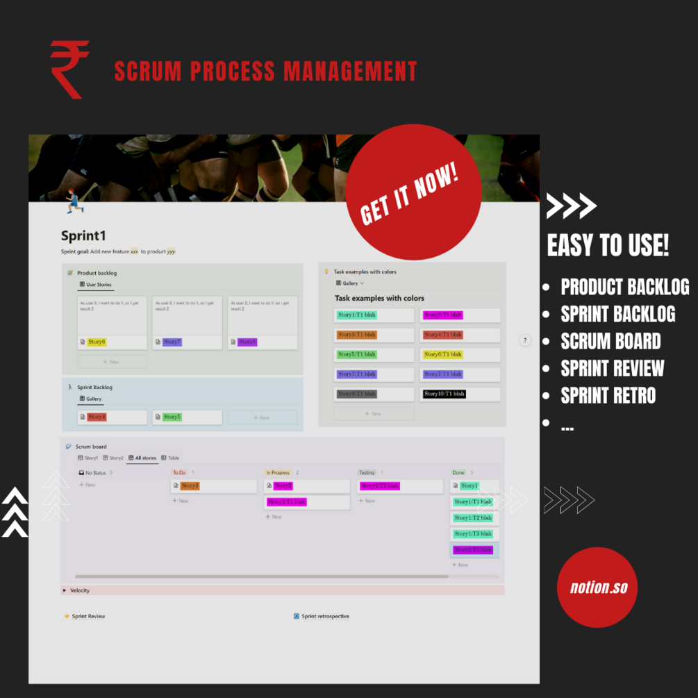 Everything you need to manage a project using Scrum Process: product/sprint backlogs, scrum board, sprint review/retro...